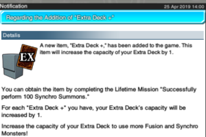ตั้งแต่วันที่ 25 April 2019 ตัวเกมก็มีวิธีปลดล็อคเพื่อให้เพิ่มช่องใส่การ์ดใน Extra Deck เป็น 6 ช่องได้ ซึ่งจะเป็นประโยชน์ในการอัญเชิญฟิวชั่น(Fusion) และอัญเชิญซิงโครว(Synchro)ให้สามารถใส่การ์ดเพิ่มใน Extra Deck ได้