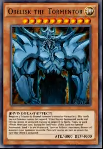 การ์ดเทพอียิปต์ใบที่สาม Obelisk the Tormentor หรือ เทพพิทักษ์โอเบลิส สุดท้ายก็ปล่อยออกมาสักที เป็นการ์ดเทพที่มีพลังโจมตีและป้องกัน 4000 โดยจะมี animation ให้ดูเมื่ออัญเชิญโดยไคบะ โดยเราสามารถเก็บการ์ดใบนี้ได้โดยการชนะอิชิชุ(Ichizu) 1 ครั้ง ในลาน(event นี้จะออกมาหลังจากชนะ Strings ที่มีการ์ดมังกรฟ้าโอชิริส (Slifer the Sky Dragon)) ใน Yugioh โลก DM(Duel Monster)