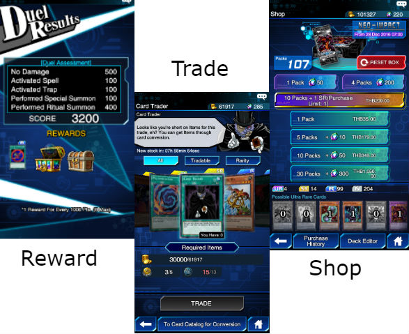 • วิธีได้การ์ดเพิ่มมีหลายแบบ ทั้งการซื้อซองการ์ดด้วยเพชรในเกมหรือใช้เงินจริง ระบบเทรดการ์ด (Trade จะใช้ได้เมื่อเล่นถึง Missions ที่ 7), ฟาร์มการ์ดจากตัวละครที่สู้ด้วย Lvl ตัวละครเราเพิ่มก็ได้การ์ดเพิ่ม