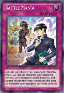 – มอนเตอร์ฝั่งตรงข้ามที่หงายหน้าทั้งหมดจะถูกเปลี่ยนให้ตั้งโจมตีและไม่สามารถเปลี่ยนสถานะต่อสู้ในเทิร์นนี้ได้ – มอนเตอร์ทั้งหมดที่ฝั่งตรงข้ามควบคุมจะต้องโจมตีในเทิร์นนี้ ถ้าสามารถสั่งโจมตีได้ |