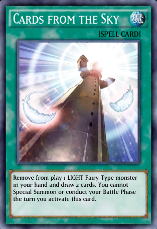 นำมอนเตอร์เผ่านางฟ้าธาตุแสงในมือออกจากเกม 1 ใบแล้วจั่วการ์ด 2 ใบ เราจะไม่สามารถเรียกมอนเตอร์แบบพิเศษหรือเข้า Battle Phase ในเทิร์นที่เราใช้การ์ดนี้ได้ |