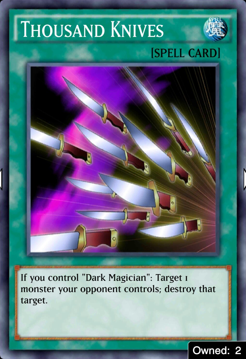 Can be used after your LP decrease by 2000. Randomly add Thousand Knives, Dark Magic Attack, and Dark Magic Expanded to your hand. This skill can only be used once per duel.