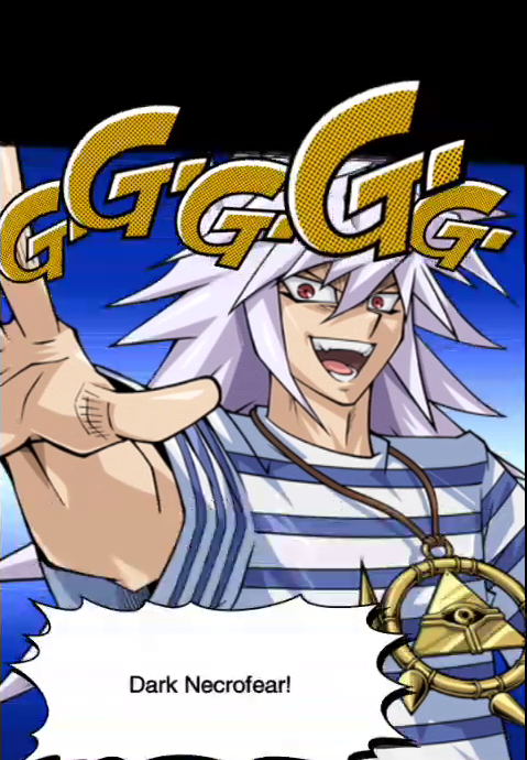 | สามารถใช้ได้ถ้าเรามี “Dark Necrofear” อยู่ในสุสานและไลท์พ้อยไม่เกิน 2000 หลังจากที่ใช้สกิลนี้แล้วผ่านไป 5 เทริน เราจะชนะทันที ผลของสกิลนี้จะถูกยกเลิกถ้า “Dark Necrofear” ถูกนำออกจากสุสาน สกิลนี้ใช้ได้ครั้งเดียวต่อการดูเอล | |
